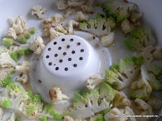 Buchetelele de conopida, lasate 30 de minute in apa rece cu sare, scurse si feliutele de conopida romanesco le-am pus intr-o tigaie la inabusit, fara ulei, doar cu sare si piper. Tigaia insa este o varianta a celei "super televizate", bineinteles varianta germana, cu strat de ceramica. E la fel cu aia care e vedeta, tot atat o sa tina, ba chiar mai mult, asa ca merita cei 65 de roni in loc de aproape triplu.