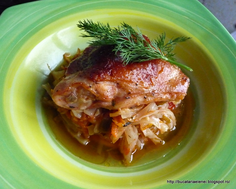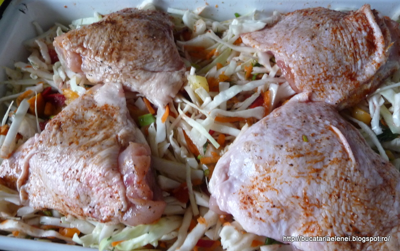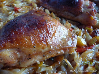 Cea de-a doua propunere la Provocarea "Bucatar curajos", la sectiunea mancare, vine din partea Adelei Zilahi. Eu m-am bucurat de alegerea ei, pentru ca de data asta de sarbatori am cam abuzat de bietul porc. De obicei ma axez pe curcan sau pui, dar in afara de niste fileuri de peste gratinate cu legume, restul fuse dezmat anul acesta. Reteta aceasta a picat la tanc si a trecut testul tuturor din familie. Cand m-a intrebat fiul meu ce miroase asa bine si i-am spus ca pulpe de pui cu varza s-a uitat mirat la mine. Ok, zice, sa vedem cum e! Concluzia finala a tuturor a fost ca este tare bun si vom repeta experienta. Acuma, trebuie sa-mi cer scuze, dar am mai intervenit putin prin reteta, doar putin.