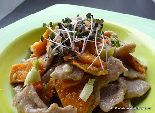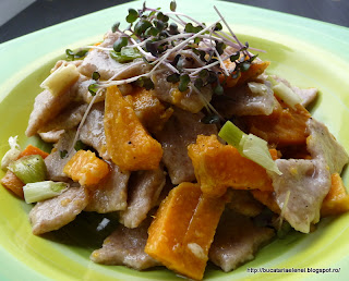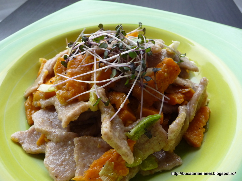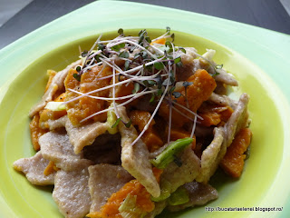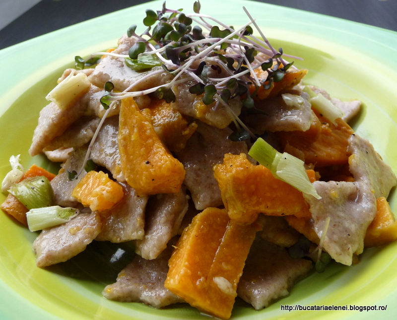 Mi-era dor de niste paste facute in casa. Duminica, vreme deprimanta si inchisa, de facut copii. Cum nu mai e cazul iar nepotii se lasa asteptati, am trecut la bucataria din dotare la prepararea unei salate si a unor paste. Cum leurda era cam "obosita", am renuntat sa fac pesto dupa reteta de aici, dar vedeta fiind leurda. Daar.... aveam cartofi culci pentru a face niste chipsuri si salate, asa ca am folosit un cartof dulce mai mare si cate ceva pe alaturi. Cea mai grozava mi s-a parut ideea sa pun si niste germeni de varza rosie tare buni pe care nu-i putea lasa sa se ofileasca. Am pus din ei la salata si mai ramasesera. Mai am de broccoli in formare si o sa mai pun de sfecla rosie ca tare au fost buni la hummus. Iar daca ajung la "Dragonul Rosu" o sa iau niste fasole mung sa fac niste germeni si din aceia cat de curand. Dar sa nu mai pierd vremea.