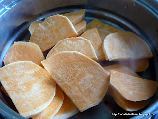 Am inceput sa fac garnitura. A taiat cartoful in jumatate si apoi felii cam de 0,5 cm grosime pe care le-am pus in vas sa fiarba la abur 5 minute.