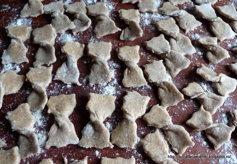 L-am intins, folosindu-ma de putina faina, in foaie subtire cam de 2 mm, am presarat cu faina si am lasat-o 10 minute inainte de a taia pastele. Am taiat cu rola fasii cat de 1,5 cm cu rola si apoi fasiile in bucati cam de 3 cm. Am strans la mijloc si am rasucit formand funditele.