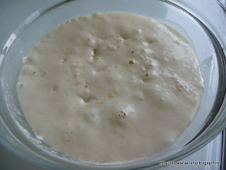 100 g din faina, drojdia, mierea si jumatate din ulei se amesteca bine cu apa calduta, pana iese ca o smantana subtire. Se acopera si se pune intr-un loc ferit de curent la crescut. Eu pun in cuptorul cu microunde, incalzit in prealabil un minut.