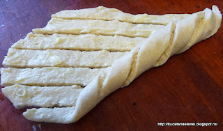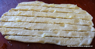 Deci din acest aluat va ies 10 coronite ceva mai mici, dar va ies 8 mai maricele, dupa cum va place. Fiecare bila din aluatul dospit se intinde intr-un oval cu o lungime de cel putin 15 cm la coronitele mai mari si de 12 cm la cele mai mici. Se unge un unt moale si se taie suvite cam de 1,5 cm latime.