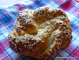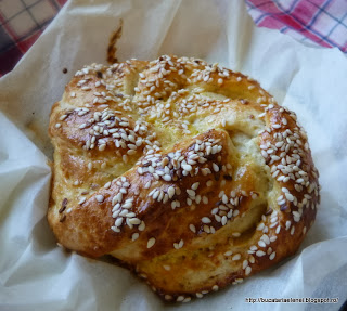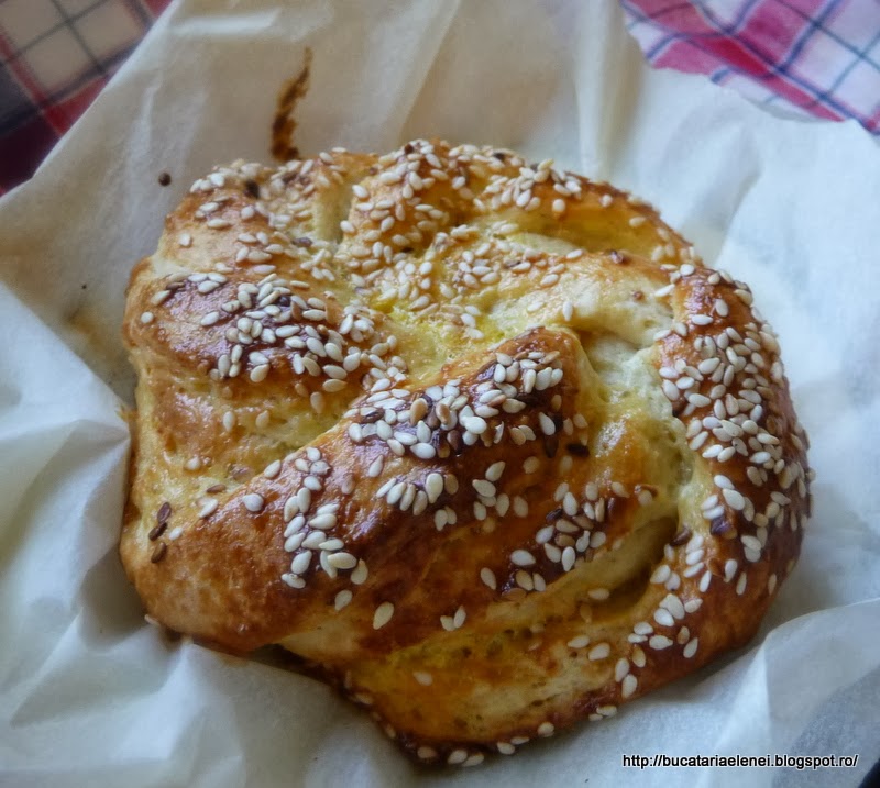 Se ung cu galbenus amestecat cu iaurt, se presoara cu susan si se coc circa 20-25 de minute in cuptor preincalzit la 180 de grade, pana se rumenesc frumos.