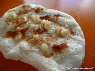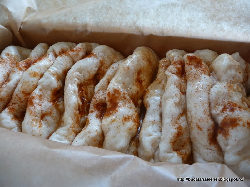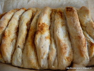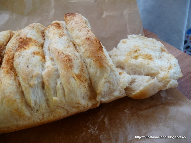 Duminica. Am vrut sa fac altceva, dar implica efort si cum ma doare in cot (la propriu) am ezitat sa fac ceva care implica forta. Mi-au ramas niste cornulete ale lui Meryem pe retina, dar ma fac eu bine si am apuc de "macelarit" aluatul acela faramicios. Asa ca am fost lenesa si am pus Bosh-ul la treaba sa framante aluatul, l-am mai dres eu de doua-trei ori doar cat sa-i dau forma si chiar si restul manevrelor le-am facut cu mana ca sa ma menajez. Nu speram sa iasa asa de buna. Poate unde nu am musafiri, nu am avut un interes deosebit sa impresionez pe cineva, poate de aceea a rezultatul a fost perfect. Aluatul este putin adaptat de aici, iar prezentarea ca aici.