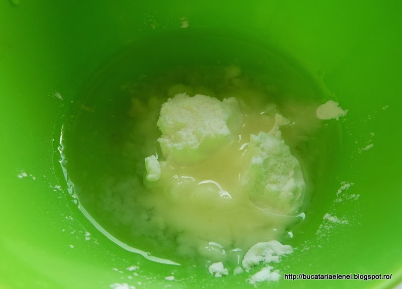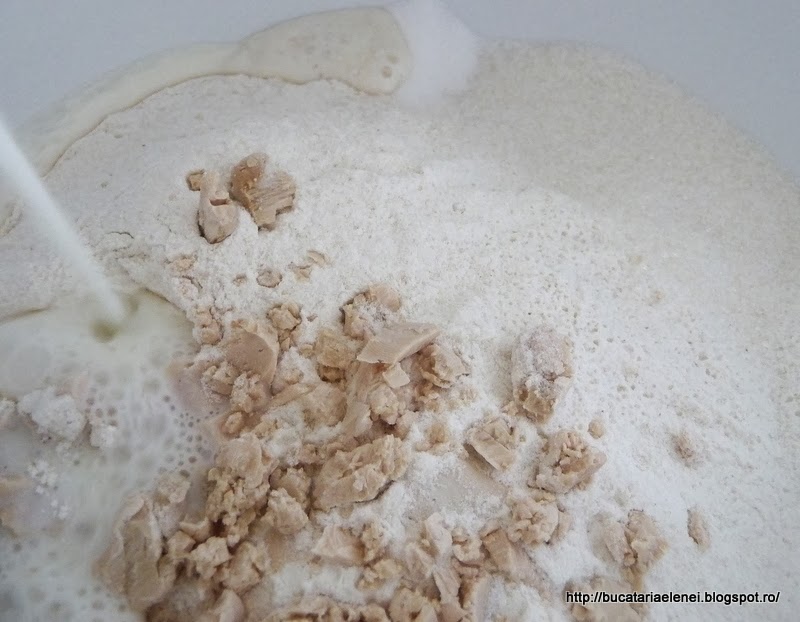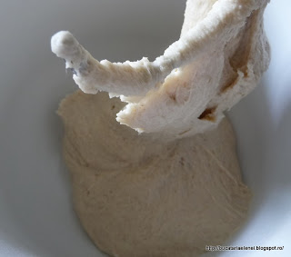 Am adaugat sarea, zaharul drojdia sfaramata, apoi am turnat laptele amestecat cu apa minerala. Am pornit robotul la prima treapta de amestecare si l-am lasat sa munceasca in locul meu.