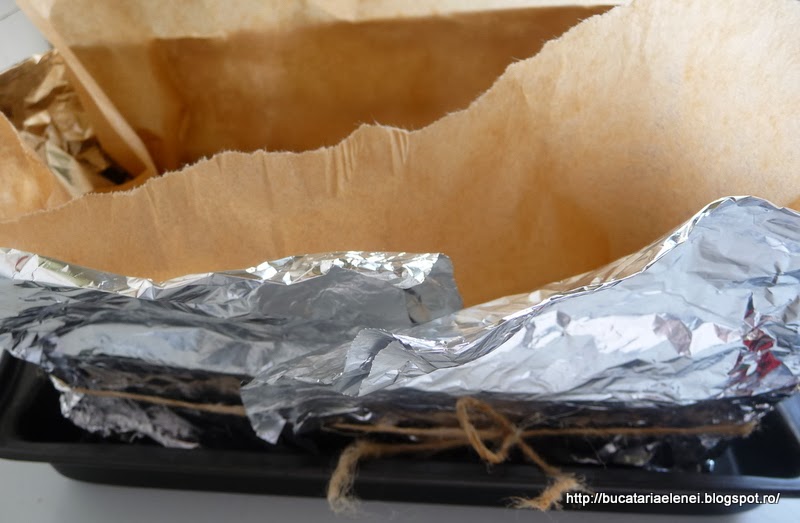 Forma de copt (de data asta de hartie speciala, nu de metal) am tapetat-o suplimentar cu hartie de copt mai mare. Am dublat cu fasie de aluminiu prinsa cu sfoara de jur imprejur, ca sa protejeze de prea multa caldura forma de hartie. Acest aranjament l-am pus intr-o tava.