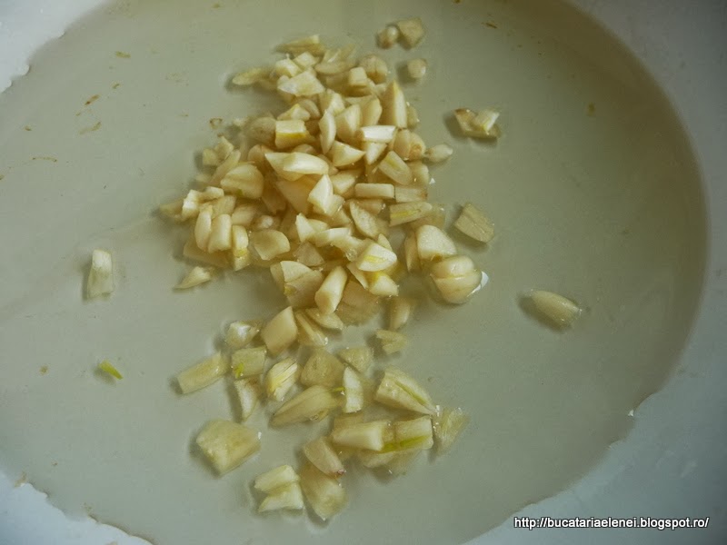 Cat creste, pregatiti usturoiul. Puneti uleiul si usturoiul intr-o tigaie la foc mic sa clipoceasca 2-3 minute, cat sa se aromeze uleiul. Se scoate separat usturoiul, iar uleiul se amesteca, dupa ce s-a racit, cu amidonul.