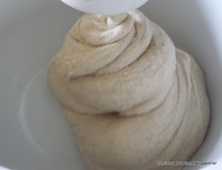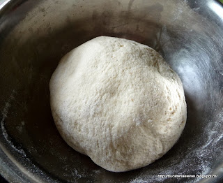 Dupa modelare cu ajutorul celor 3 linguri de faina, devine elastic dar tot moale. Am pus bolul in cuptorul cu microunde la crescut cam 45 de minute, pana-si dubleaza volumul. Nu lasati mai mult pentru ca nu va mai fi la fel de pufoasa painea dupa coacere.