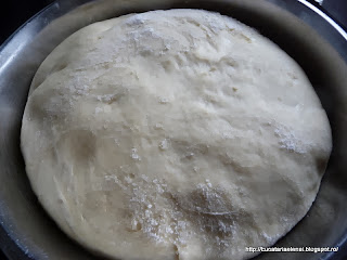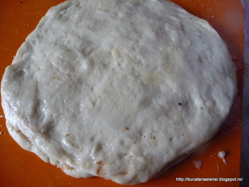 Cu mainile infainate scoateti aluatul, care este molcut, il adunati frumos intr-o bila si-l puteti intr-un castron uns cu ulei. Apoi eu las sa functioneze cuptorul cu microunde 3 minute la putere maxima, opresc si pun vasul cu aluat la crescut.