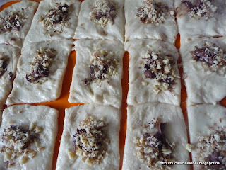 Scoateti aerul din bila de aluat, amestecand doar putin, intindeti cu mainile o foaie de 40 cm x 30 cm, o ungeti cu lingura de ulei. Apoi taiati foaia cu cutitul pe lung, formand trei fasii egale si in sens invers formand 5 fasii egale. Vor rezulta 15 patrate pe care veti pune crema de ciocolata si miez de nuca zdrobit.