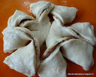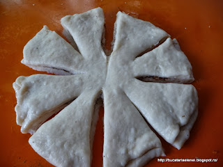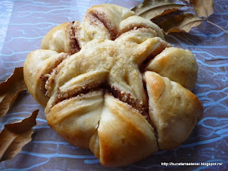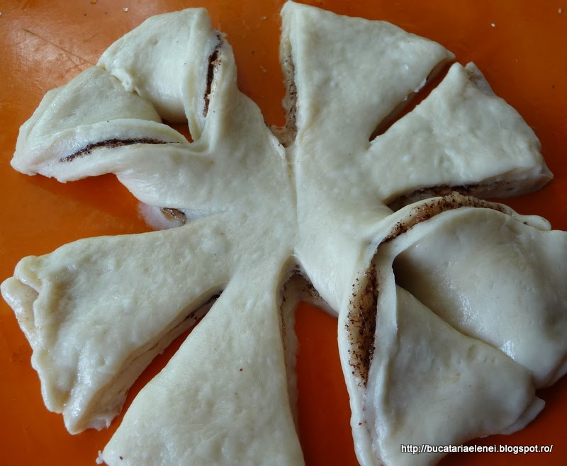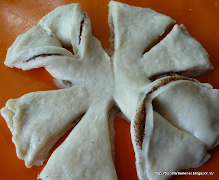 Din restul de aluat (pe care l-am facut in plus) am intins doua discuri cam de 24 cm fiecare, am uns cu ulei, presarat zahar brun, scortisoara si miez de nuca zdrobit pe unul din discuri si am acoperit cu celalalt. Am presat usor uniform si apoi am facut niste taieturi, impartind in 4 si apoi in 8, dar lasand la mijloc un cerc cam cat gura unui pahar obisnuit. Am rasucit cate doua fasii, una in stanga si alta in dreapta, dar reunind capetele si apoi marginile se aduna, ca aici.
