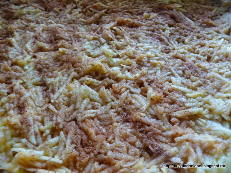Merele spalate, curatate de coaja, se razuiesc direct in tava pe hartia de copt (da, nu e nici o greseala!!!). Se intind merele rase uniform, usor presate, sa formeze un strat cam de un centimetru. Se presoara scortisoara si nucsoara peste "blatul" de mere.