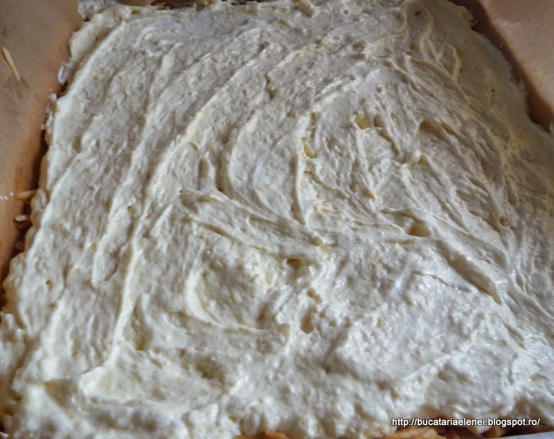 Se intinde aluatul in strat uniform peste mere. Se coace in cuptor incalzit la 160-170 de grade pe pozitia de sus pana se aureste usor bezeaua si se coace devenind putin crocanta la suprafata.