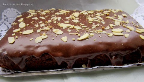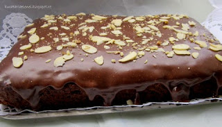 La reteta asta m-am inspirat de aici. Mie insa mi s-a parut ca fara pic de grasime ar iesi o prajitura cu o consistenta prea uscata. Si apoi, glazura am facut-o dupa gustul meu si am mai adaugat si niste fulgi de migdale ca decor si gust. Altadata o sa adaug si ceva fructe uscate in aluat de genul caise, poate prune sau altele, la inspiratie. E un dulce foarte usor de facut, mai greu o sa fie cu asteptarea, ca se coace in timp ceva mai indelungat.