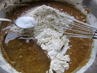 Am amestecat si am adaugat cafeaua preparata, amestecand energic sa se omogenizeze si sa se topeasca zaharul. Am adaugat faina "in ploaie", amestecand cu telul mereu, ca sa se incorporeze bine. Am adaugat la sfarsit uleiul si bicarbonatul.