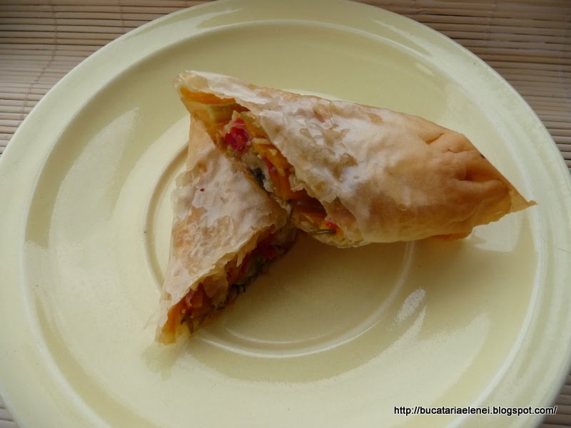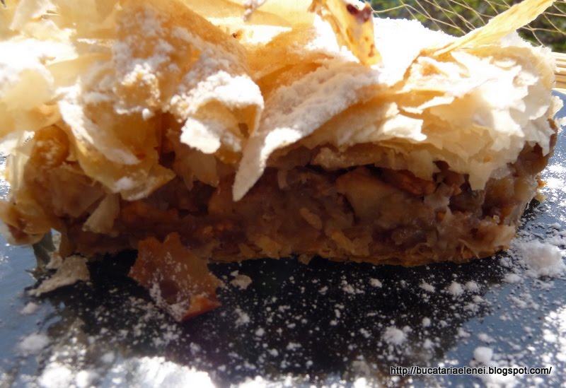 Aceasta prajitura o faceam inainte cu un aluat preparat de mine in foi subtiri, dar nu iesea asa grozav. Saptamana trecuta am vazut faza asta de impachetare si infoiere intr-o emisiune pe Euforia TV, dar cu alta umplutura. Mi s-a parut deosebita si am zis sa incerc. A meritat pe deplin, iar umplutura, nu foarte dulce, este aromata si usoara. Singura problema cu foile de cumparat este ca trebuie sa te misti repede, pentru ca se usuca foarte usor! Eu zic sa incercati si asa, iar surpriza va fi foarte placuta.