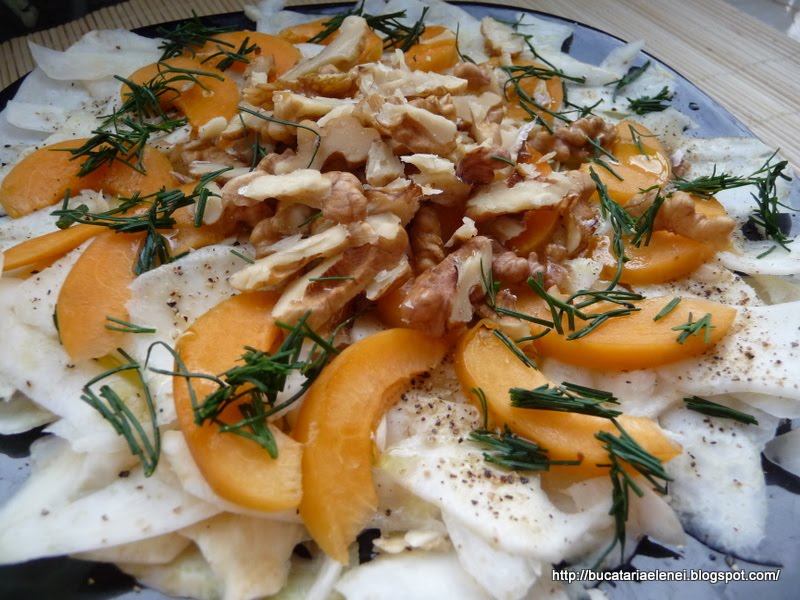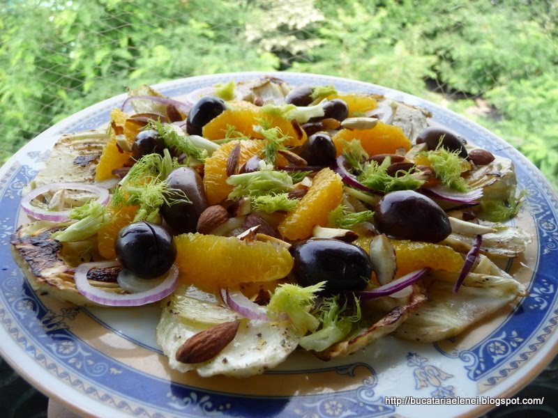 Acum doi ani, intr-o emisiune culinara (nu-mi cereti acum si numele ei ca nu-mi amintesc nici daca ma pici cu ceara!) am vazut o salata cu fenicul care m-a incitat, dar cum fenicul se gasea mai rar si era scump... am asteptat vremuri mai bune. Vorba vine! Acum cateva zile am vazut o salata asemanatoare in emisiunea Laurei Calder difuzata de Euforia TV in cadrul Euforia Cuisine. Dar i-am adus si eu mici contributii, pastrand doar alaturarea feniculului cu maslinele. Este grozava aceasta prietenie! Cum salata asta, in functie de ce o insoteste, este potrivita la 3 din cele patru zile ale dietei, am trecut la executie.