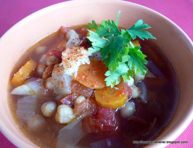 Nu, nu am incheiat serialul dedicat dovleacului! Numai ca intervin diverse evenimente care ma fac sa mai intrerup din cand in cand acest serial. Asa este cazul unui concurs la care m-am decis sa particip, organizat de Mimmi si Laura. Am primit o invitatie atat de amabila, ca nu se putea sa lipsesc. Un pic mai greu a fost sa respect o dorinta a organizatoarelor, sa gasesc o reteta care sa corespunda dietei mele, dar nu din cauza ca nu erau retete dietetice de unde sa aleg, nu! Dar combinatiile permise la Dieta Rina au cateva  reguli stricte. Am gasit o reteta care m-a tentat mult, desi nu este spectaculoasa la prima vedere,dar surpriza a fost pe masura, supa de naut aromata.Nu mi-am permis decat o mica modifificare la preparare si adaugarea unei linguri de ulei de masline.