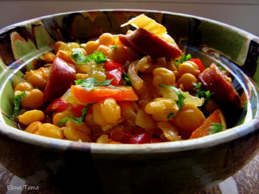 Eram cu prietena Dana intr-o discutie despre toate si nimic special cand m-am lamentat ca n-am nici o idee cum sa fac o reteta cu naut. Bine, discutia pornise de la ideea ca anumite produse acum sunt de lux si de fita iar in momentele copilariei mele erau mancarea saracului, dar este irelevant asta. I-am zis ca as face ceva mai altfel decat o salata sau ceva indian - care-mi plac, am chiar multe retete pe care am apucat sa le si scriu pe blog - iar ea a venit cu ideea sa fac aceasta reteta. Fusese saptamana spaniola la un market, aveam 2 feluri diferite de chorizo, asa ca acest garbanzo con chorizo a venit la tanc. Pana si ea a fost multumita de cum arata la final, chiar daca iar fac o reteta care nu e de post - e deja o alta discutie de cum suntem apostrofate amandoua pe facebook atunci cand punem cate o idee din asta in plin post al Pastelui. Optiunea de a tine post sau nu pentru mine e ceva foarte intim privind credinta si cum eu nu ma amestec in viata altora ma astept ca si aceia care se opresc pe profil sa vada ce postez sa ma respecte suficient si sa nu-mi scoata ochii pentru ce fac in gradina mea. Civilizat ar fi - e valabil si pentru blog - ca atunci cand nu-ti place ceva in mediul virtual sa treci mai departe la ce-ti place si nu sa te apuci sa pierzi timp pretios ca sa apostrofezi pe cineva, de cele mai multe ori intr-un limbaj greu de reprodus sau agramat. In fine, sa trecem la reteta inspirata de produsele de la Sano Vita